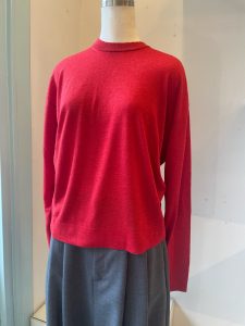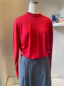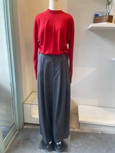 赤のプルオーバーにチャコールグレーのワイドパンツを合わせたシンプルなスタイルながら、上質な素材と計算されたシルエットが引き立つ、ATONコーディネートです。