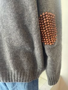 背面に配されたウッドパールのエルボーパッチが、BLESSならではのユニークなデザイン。