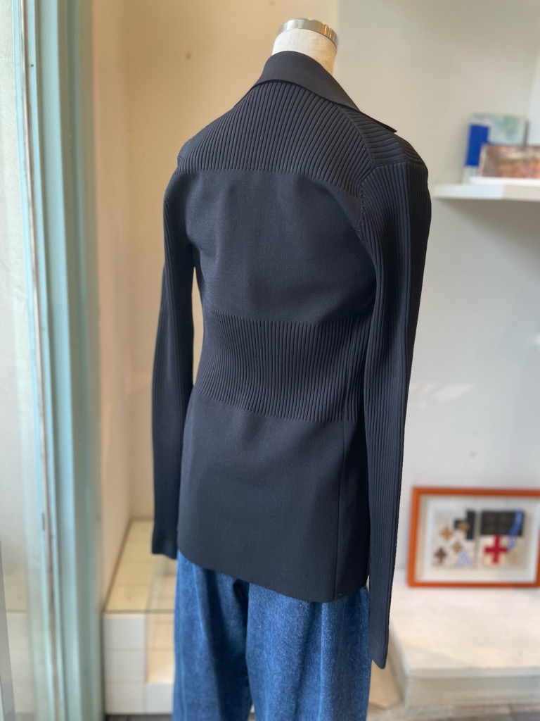 天竺とリブのコンビネーションで仕立てられたニットトップは、レーヨン83%、ポリエステル17%の混紡素材を使用。ほどよい肉感と伸縮性が身体に自然に添い、美しいシルエットに。
