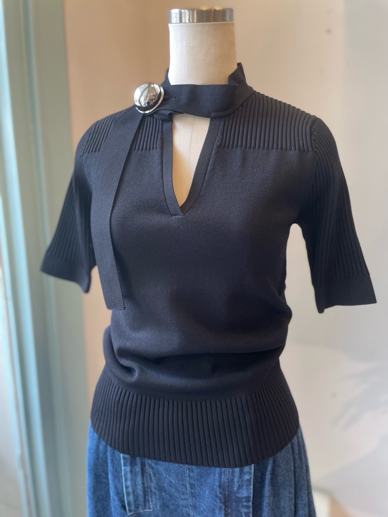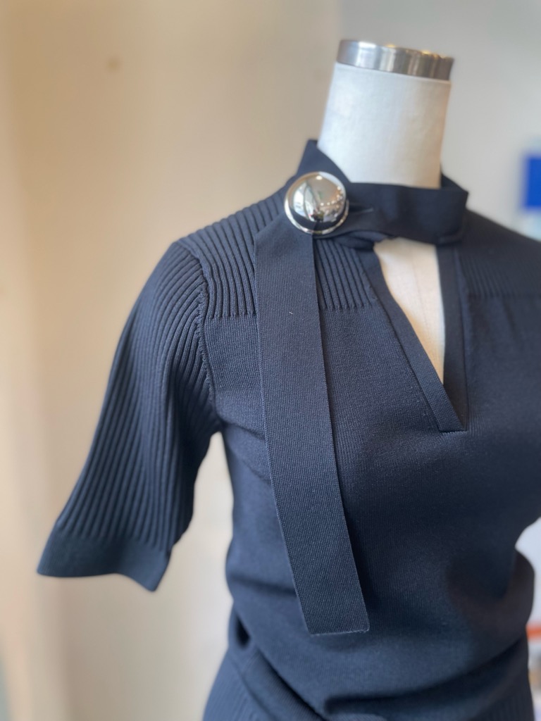 首元にはブランドを象徴するアイコニックなボタンを配し、さりげないアクセントをプラスしています。