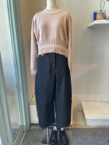 ニットのコンパクトな丈感とのバランスもよく、シルエットのコントラストが際立ち、すっきりとした印象になります。