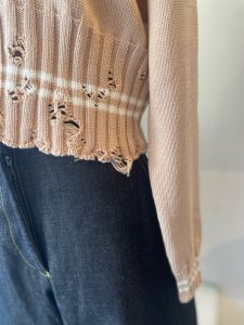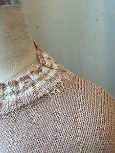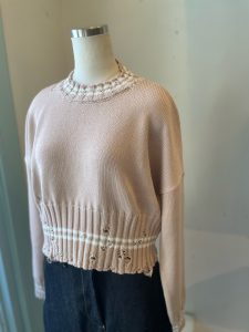 柔らかなピンクベージュが印象的な、コットン素材を使用したクロップド丈のニットプルオーバーです。