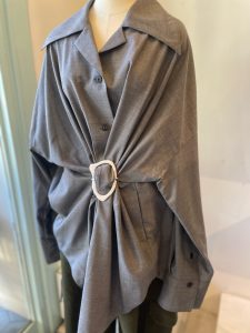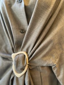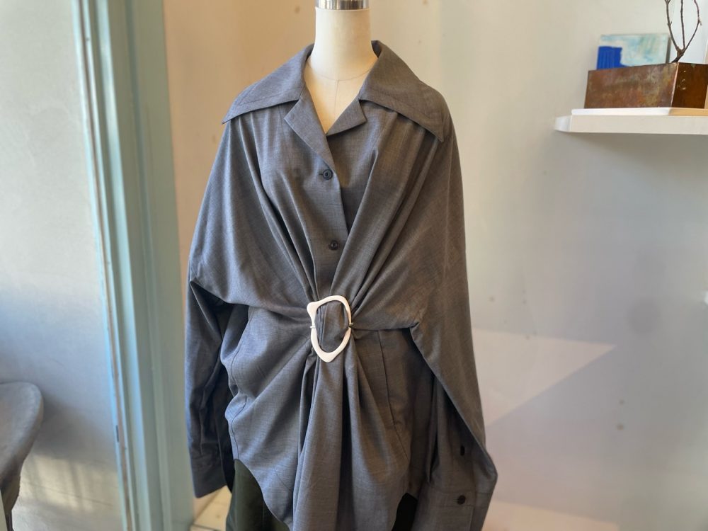 フロントにあしらわれたアイコニックなバックルがポイントで、布の流れを美しく引き立てます。