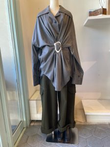 グレー×カーキの落ち着いたトーンで、HARUNOBUMURATAらしいモードスタイルです。