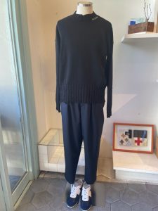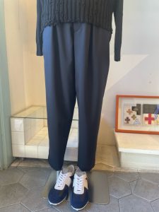 今までボリュームのあるスニーカーが多かったですが、新作の薄底スニーカーで合わせるだけで、定番のニット&パンツもまた違う雰囲気になります。