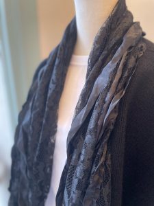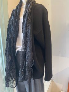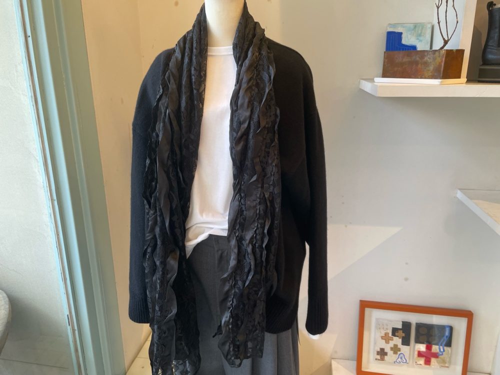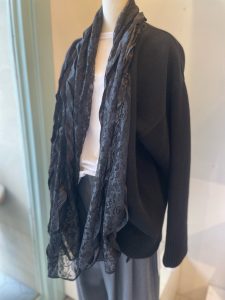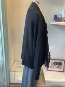 ニット本体は落ち着いたブラックトーンで構成され、すっきりとしたシルエット。そこに繊細なレースが重なり合うことで、光の当たり方や動きによって表情が変化します。