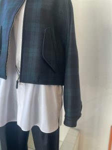 ショート丈のバランスは非常に計算されており、パンツ・スカート問わずスタイリングに取り入れやすいのが魅力です。