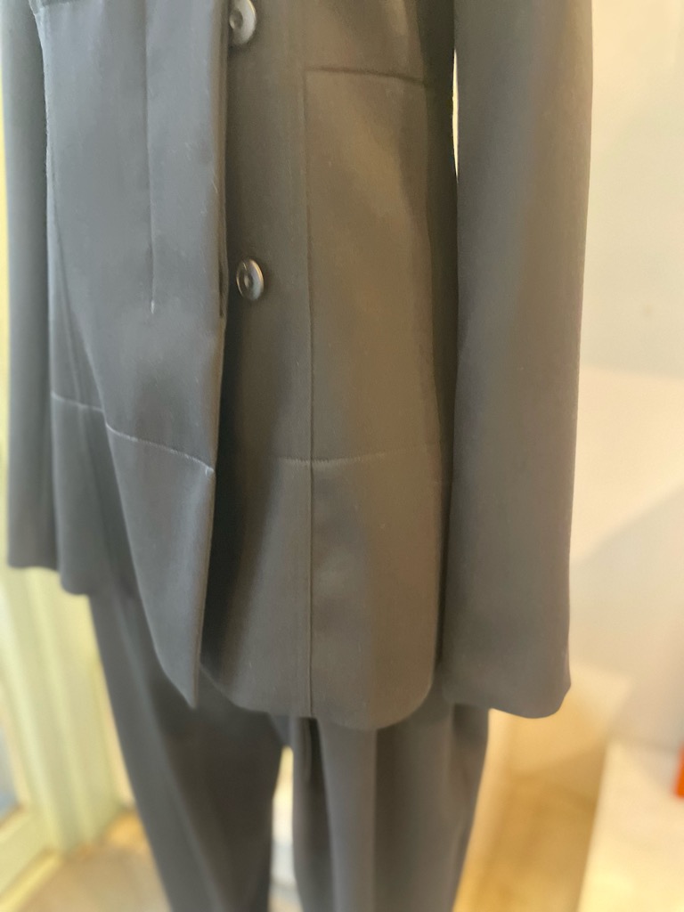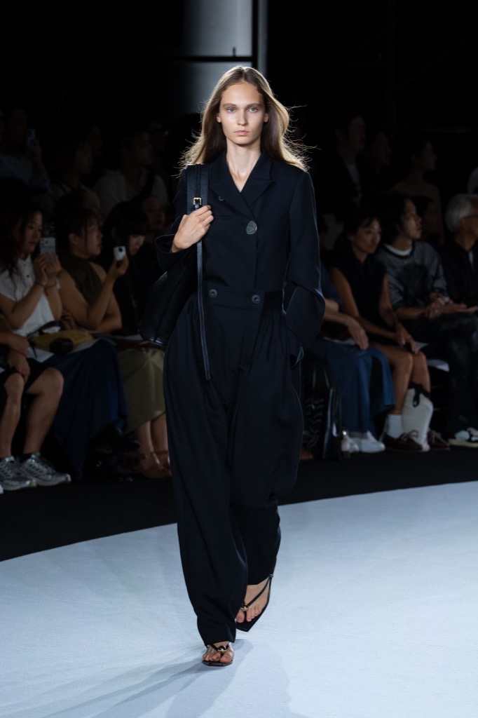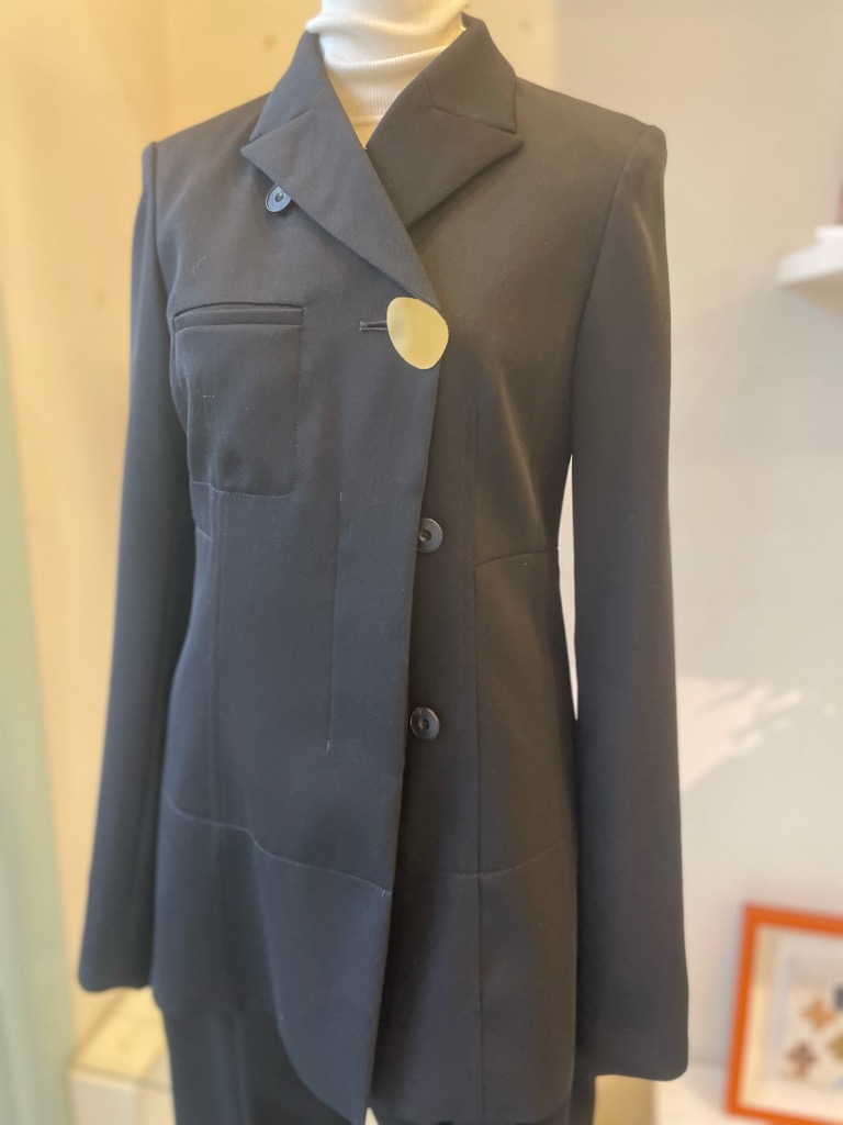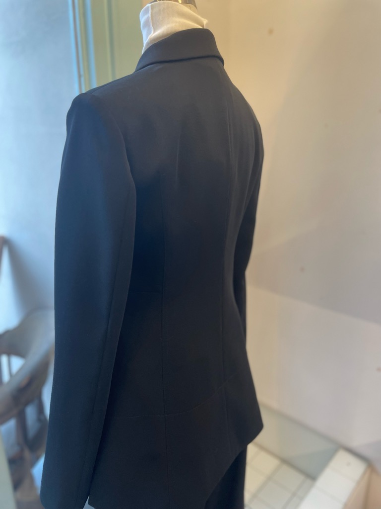 ジャケットは身体に沿うよう設計された細身のシルエット。構築的でありながらも硬さを感じさせず、自然なドレープが美しく引き立ちます。