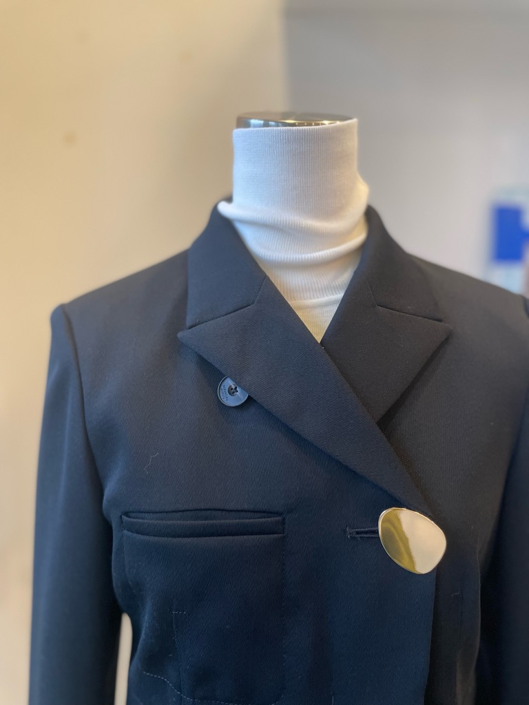 胸元に添えられたイタリア製のプレートボタンは、ジュエリーのようにさりげなく輝き、ミニマルな中に確かな個性をプラス。