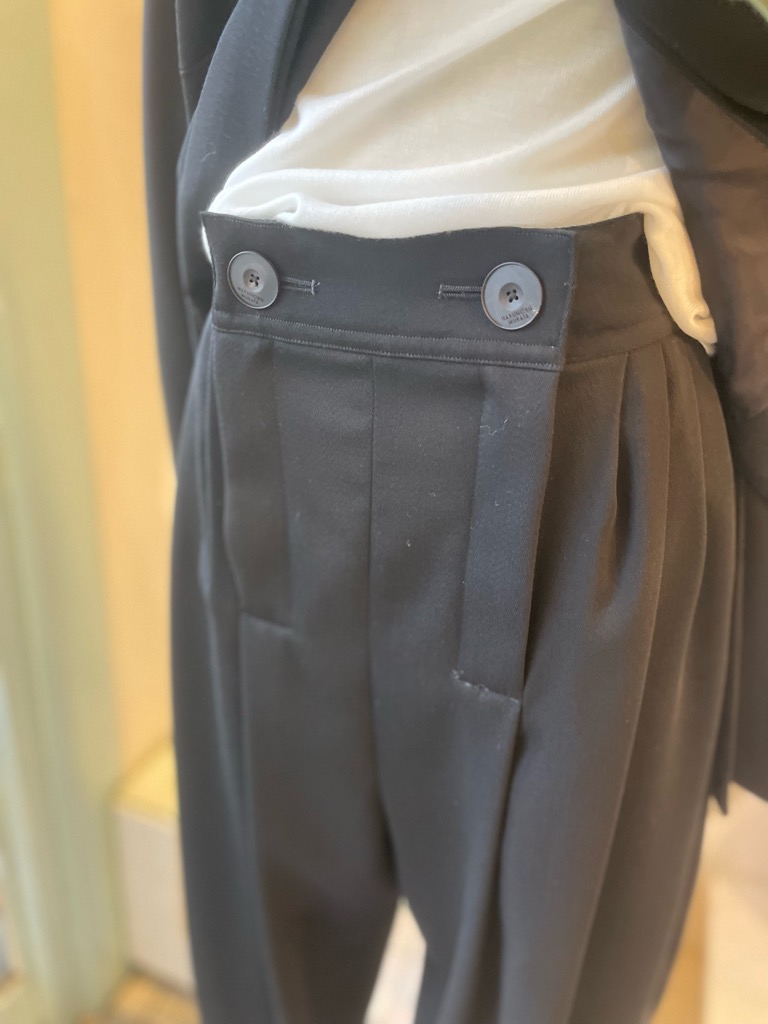 今季のHARUNOBUMURATAの、洗練された空気を纏うウールツイルのジャケットとパンツのセットアップ。