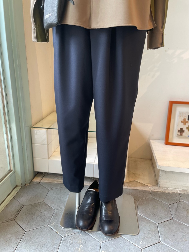 ボトムスには、同じくトロピカルウール素材を使用したテーパードパンツを合わせています。