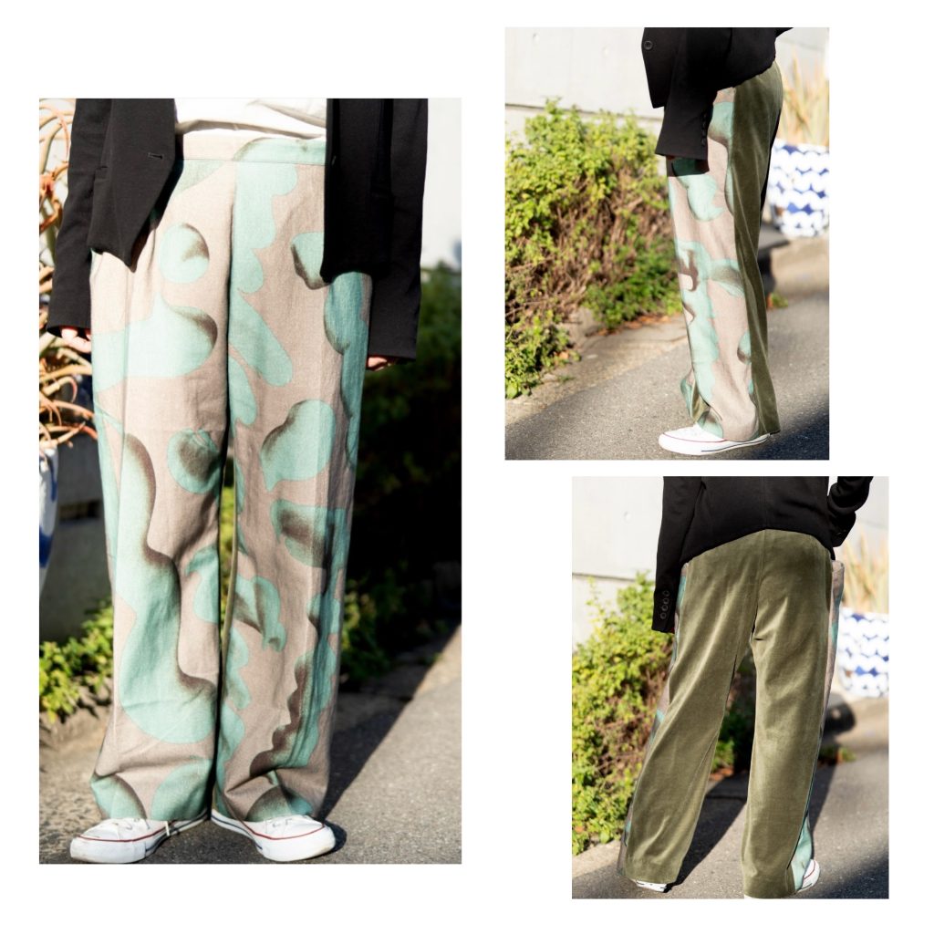 前後で素材感を変え、落ち感の良い新作のパンツです。